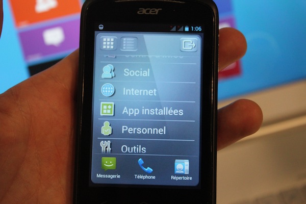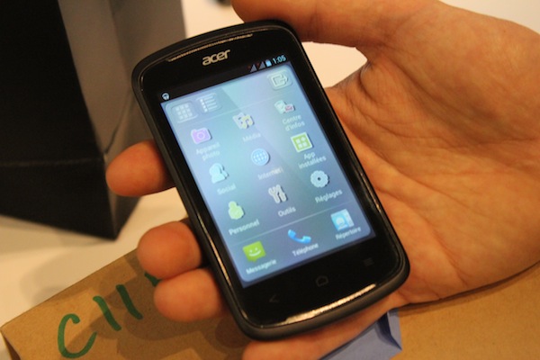 La philosophie derrière le smartphone reste la même : on retrouve un engin Acer qui se reconnaît au premier coup d'oeil, bien fini et très compact. La prise en main est excellente et le système a très peu été modifié par le constructeur. Dans les entrailles, les composants ont été à peine améliorés, mais ce n'est pas vraiment la technique qui compte sur un appareil de ce genre. Vous retrouverez un appareil de 3 mpx à l'arrière et quelques personnalisations de l'interface par Acer mais rien qui ne pourrait défigurer Android. Notez enfin la présence d'un lanceur alternatif conçu pour les débutants ou les personnes peu habiles avec les nouvelles technologies : grosses icônes, simplicité d'accès aux fonctions, bref, on retrouve un environnement qui rappelle les feature phones, ces ancêtres des smartphones.