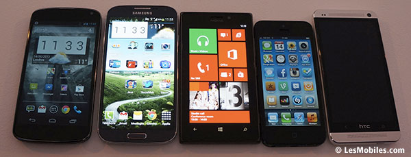 De gauche à droite : Google Nexus 4, samsung Galaxy S4, Nokia Lumai 925, iPhone 5 et HTC One