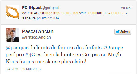 Face à cette révélation, Pascal Ancian, Vice-Président d?Orange Business Services n'a pas tardé à twitter en réponse à un message de nos confrères de PC INpact afin de clarifier la situation : « la limite de fair use des forfaits Orange perf pro 4G est bien la limite en Go; pas en Mo/h. Nous ferons une clause plus claire ! »
