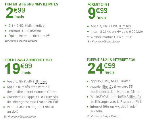 Le Forfait 24/24 est quant à lui toujours proposé à 9,99?, mais les clients pourront désormais souscrire à cette même option Internet de 100 Mo pour 1? supplémentaire chaque mois. Aucun changement à noter du côté du Forfait 24/24 & Internet 3 Go à 19,99?.