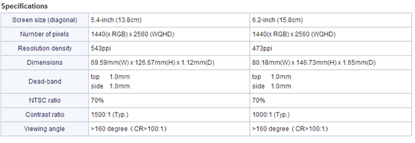 Si les écrans de nos smartphones semblent avoir atteint la limite en termes de taille, la marge de progression semble infinie lorsqu'il est question de résolution. La Full HD 1080p, standard de 2013, laissera déjà bientôt place à des résolutions plus élevées. En aout dernier, LG présentait un premier écran de 5,5" capable d'afficher une définition de 2560 x 1440 pixels. C'est aujourd'hui au tour de Japan Display de porter cette résolution sur un écran pour smartphones, ou deux, arborant des diaognales de 5,4" et 6,2". Cela se traduit par des densités de pixels de 543 ppp et 473 ppp respectivement.