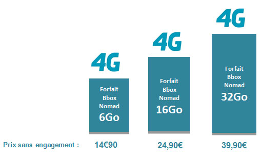 Le prix du forfait est identique avec ou sans engagement. Si le client souhaite s'engager (12 mois), le hotspot Bbox Nomad revient à 1? avec l'offre 32 Go, 19,90? avec l'offre 16 Go et 29,90? avec l'offre 6 Go (au lieu de 109,90?, sans engagement).