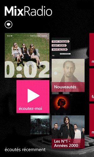 Le service offre notamment des centaines de mix, sans publicités, connexion ou inscription, et qui pourront être sauvegardés pour les écouter hors ligne. Nokia MixRadio avec Ecoutez-moi est à présent disponible sur Nokia Lumia dans 31 pays, dont la France. Une version payante est également disponible.