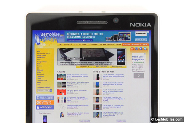 Vu de face, le mobile fait cependant beaucoup plus carré. D'abord parce que la dalle de verre va désormais jusque dans les coins (contrairement aux prédécesseurs, où les angles de l?écran et du châssis étaient différents). Les bordures restent cependant assez larges sur les côtés, mais se sont amincies sur le dessus. Sous l?écran, vous retrouvez la zone tactile avec les touches de navigation. Amusant que Microsoft n'ait pas pris la peine de virtualiser ses touches, comme Android.