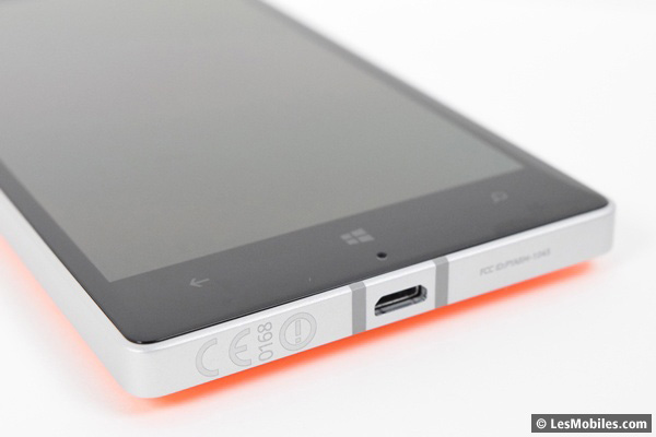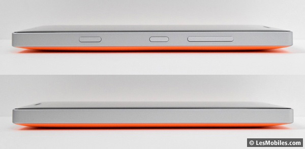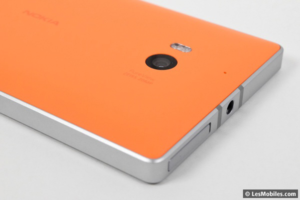 Faisons le tour des autres tranches. À gauche, rien. À droite, le volume, la sortie de veille et le bouton dédié à la photo. Excellente idée de Nokia de conserver un bouton matériel pour accompagner un capteur photo 20 mégapixels. En haut, le port jack 3,5 mm et l'emplacement pour la carte nano SIM. Le contour du smartphone est en métal. Ce qui a un avantage et un inconvénient. D'une part, cela assure une construction solide du mobile, impression renforcée par le design unibody. D'autre part, cela irradie plus la chaleur si le chipset a tendance à chauffer. Et justement, le Snapdragon 800 a ce petit défaut.