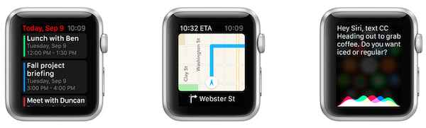 Les applications disponibles sont déjà nombreuses et incluent Heure, Calendrier, Plan, Photos, iTunes, Mail, Message ou encore Siri. L'assistante virtuelle d'Apple est en effet disponible, même si toute l'intelligence se retrouve dans l'iPhone associé. Deux applications sont à noter : Workout et Activity. La première est liée au fitness et calcule les efforts en fonction de l'exercice sélectionné. La seconde est liée à la santé et sert à calculer les efforts réalisés dans une journée : exercice physique, marche à pied et état stationnaire (debout). Un diagramme aide l'utilisateur à y voir plus clair. Bien d'autres sont prévus. Et Apple a officialisé WatchKit, le kit de développement dédié à l?Apple Watch.