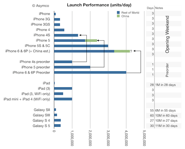 Les ventes des iPhone 6 et 6 Plus sont meilleures que tous les lancements précédents, d'Apple, mais aussi de la concurrence sur tablette ou sur smartphone. L'illustration ci-dessous, diffusée par le site Asymco, mesure le nombre d'unités vendues par jour durant la période de lancement (soit 3 jours). Il montre la montée en puissance de chaque génération de smartphone Apple, une progression qui se retrouve également dans le rythme des précommandes. Et qui continue de croître chez l'iPhone, alors que l'iPad est fluctuant et les Galaxy S de Samsung ralentissent. C'est avec un tel graphique qu'il est plus facile de mesurer pourquoi Apple ne s'appuie que sur un seul lancement par an : parce qu'il n'y a pas besoin de plus pour vendre des millions d'unités.