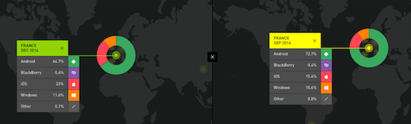 Le résultat est simple : iOS a progressé quasiment partout dans le monde. Et parfois très fortement. Et même assez pour prendre la première place à Android. C'est par exemple le cas aux États-Unis où iOS représente 47,7 % du marché (+15,1 points), contre 47,6 % pour Android (-14,2 points). De même en Australie : iOS détient 45,1 % du marché et Android 43,7 %. Là-bas, l'iPhone 6 a poussé son OS de 10,4 points en trois mois.