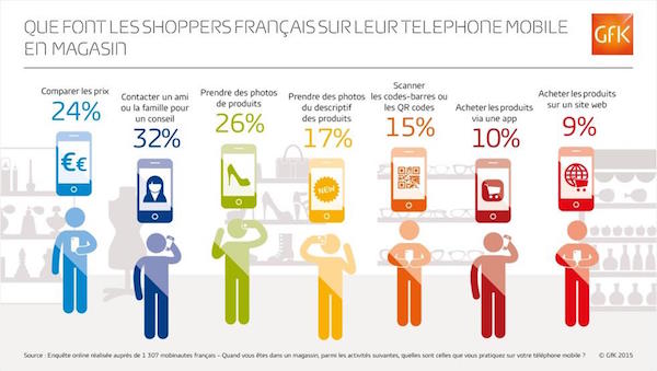 L'institut d?étude GfK a réalisé une étude internationale sur le comportement des propriétaires de smartphones lors d'un achat en magasin. Ce rapport mesure à quel point le smartphone influence l'acte d'achat. Plus encore, il montre que le portable a transposé dans les magasins physiques des réflexes liés à l'origine au commerce électronique « classique ». Notamment le fait de comparer les prix, prendre des produits en photo ou acheter sur un site marchand.