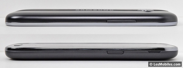 En tournant le smartphone, vous remarquerez que le liseré argenté, en plus de couvrir une partie des tranches évidemment, entoure également le micro en bas (mais pas le port microUSB à sa gauche) et la prise jack en haut. Bien que la pièce soit en plastique, c'est tout de même rassurant de savoir que, même en retirant le capot aux emplacements microSIM et microSD ou à la batterie, rien ne devrait bouger autour de la prise, généralement assez fragile. D'ailleurs, les boutons ne bougeront pas non plus puisqu'ils sont intégrés entre le cadre et le capot, à droite pour l'alimentation et à gauche pour le volume.
