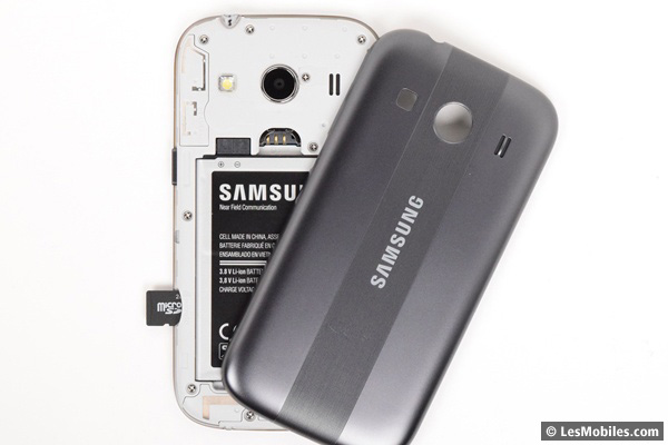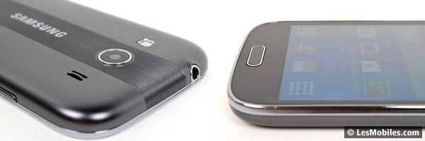 Il faut entièrement retourner le smartphone pour trouver la seule réelle originalité du smartphone. Une bande striée traverse le capot dans sa longueur. La signature de Samsung est prise dedans, tout comme l'appareil photo, ainsi séparé du flash et du haut-parleur qui l'entourent. L'intention était louable mais le résultat n'est pas vraiment probant. Ces lignes en relief n'apportent pas grand chose à la prise en main et confèrent au smartphone une allure de jouet pour enfant, type voiture de course miniature. Le seul réel avantage, c'est que vous n'aurez pas de traces de doigts sur cette partie mais il y en aura tout de même à côté.