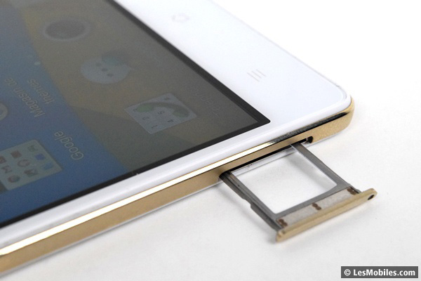 Le modèle reçu en prêt à la rédaction est très ostentatoire : robe totalement blanche à l'avant et à l'arrière surmontée sur les tranches par un renfort doré. Le même traitement est réservé au capteur photo protubérant dans le coin supérieur gauche. Le logo de la marque, juste en dessous, est imprimé dans la même couleur. Si ça, ce n'est pas « bling-bling », qu'est ce que c'est ? Sachez qu'il existe aussi une version argent un peu moins tape-à-l'oeil.