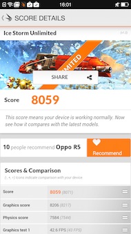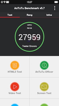 Cette belle interface est servie par une plate-forme milieu de gamme axée sur le Snapdragon 615 qui apporte fluidité et réactivité. Les scores obtenus par le R5 sont très proches des mobiles disposant de la même configuration, sans bonne ni mauvaise surprise. Le mobile atteint quasiment 28 000 points sur AnTuTu, un peu en dessous donc du haut de gamme de 2013 (sous Snapdragon 600 et 800). Sur 3DMark, le smartphone dépasse les 8000 points. Et sur Basemark OS, il parvient à 733 points. Sur AnTuTu Video, le Oppo R5 atteint 475 points, ce qui, dans la nouvelle version de ce test, n'est pas très bon. Sur les trente formats testés, seuls, 10 passent normalement et 18 ne sont pas reconnus.