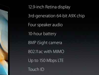 Officiellement, l'iPad Pro est une tablette de 12,9 pouces pour travailler de façon ergononomique en situation de mobilité. 30,6 cm de large. 22,1 cm de hauteur. 6,9 mm d'épaisseur (soit 0,8 mm de plus que l'iPad Air 2). Elle pèse 713 grammes, soit 200 grammes de moins que le dernier MacBook 12 pouces. L?écran est évidemment multi-touch avec une protection en verre renforcé oléophobique. Sa définition est légèrement supérieure au Quad HD : 2732 x 2048 pixels, soit la même résolution que les iPad Air (264 pixels par pouce). Avec ses grandes tablettes, Apple ne fait pas encore l'effort d'implanter la résolution retina de l'iPhone ou de l'iPad Mini (324 pixels par pouce).