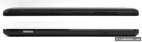 Inutile de craindre les traces de doigts, ce dernier ne couvre qu'une partie infime des tranches avant de passer le relais au capot en plastique mat (et imitation cuir au dos), avec les boutons intercalés entre les deux. Il y en a deux à droite, un noir pour l'alimentation et un plus voyant et travaillé pour la photo en-dessous. Nous sommes surpris de trouver ce dernier, dans le bon sens. Notons également la présence d'une petite encoche pour faciliter le retrait du capot sur le même côté, alors que les commandes du volume sont à l'opposé.