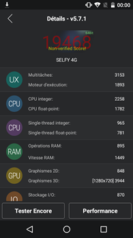 Nous n'avons pas rencontré de ralentissements particulièrement gênants lors de la navigation alors que les applications se lancent plutôt rapidement, même s'il y a parfois un peu d'attente pour le chargement des contenus. Ce n'est pas franchement étonnant compte tenu du chipset que l'on trouve au coeur du Selfy 4G. C'est un MT6735P de MediaTek, variante 4G « worldmode » et beaucoup moins rapide du MT6732. Nous retrouvons les quatre coeurs Cortex-A53 pour le CPU, mais cadencés ici à 1 GHz contre 1,5 normalement, alors que le Mali-T760 est remplacé par un plus modeste Mali-T720 pour la partie graphique.