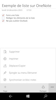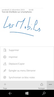 Il est également possible d'ajouter une photo (à prendre sur le vif) ou une pièce jointe (une photo de la photothèque, un fichier quelconque en local ou sur le stockage réseau, ou un lien URL). Évidemment chaque note est sauvegardée sur le OneDrive, l?épine dorsale de l'offre de Microsoft, et accessible sur les autres versions de l'application (web, Android, iOS, Mac OS, PC). De plus, il est possible d?épingler une note sur le bureau, apportant une alternative à la fonctionnalité Badge OneNote, développée par Microsoft sur Android.