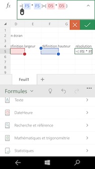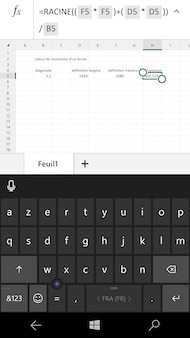 Si écrire un texte et le mettre en page est déjà assez compliqué sur un écran d'une taille comprise entre 5 et 6 pouces, Excel et PowerPoint sont encore plus taquins. Dans l'exemple ci-contre, nous avons essayé de reproduire dans Excel la formule mathématique qui permet de calculer la résolution d'un écran (en pixel par pouce) en fonction de la définition et de la diagonale de la dalle. Et il faut bien avouer que la démarche est loin d?être évidente. Le point positif est l'intégration de toutes les formules d'Excel, hormis les macros qui sont absentes de toutes les versions pour mobile (iOS, Android ou Windows 10 Mobile).