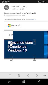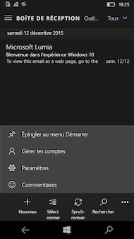 Côté mail, rien de bien original. Ici aussi, les comptes iCloud, Gmail, Exchange et IBM sont pris en charge. Vous pouvez épingler sur l'accueil du smartphone une boîte de réception en particulier si vous ne souhaitez pas voir afficher tous vos messages dans la tuile interactive. Beaucoup plus statique, Outlook perd légèrement en homogénéité dans cette nouvelle mouture, contrairement à Skype qui conserve la prise en main de Windows Phone, tout en optant pour des codes couleur plus lumineux (du blanc et du bleu et non des lettres blanches sur fond noir).