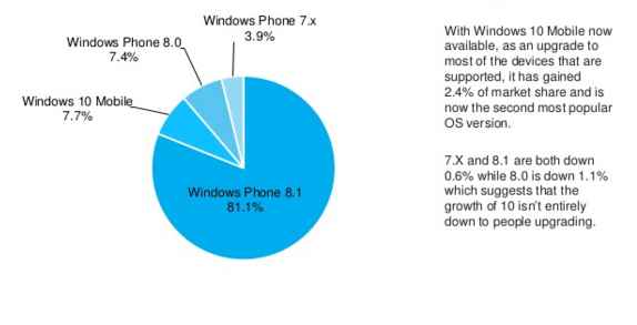 Rassemblons donc toutes ces données. En six mois, Windows 10 Mobile a convaincu 1 % des utilisateurs d'anciennes versions. Plus de 10 % des téléphones fonctionnent encore avec une version antérieure à 2 ans. Et la moitié des 80 % de mobiles sous Windows Phone 8.1 sont éligibles à Windows 10. Cela veut dire que, sans renouvellement massif des terminaux, Windows 10 pourrait potentiellement fonctionner sur 47 % des mobiles actuellement en circulation. Et c'est là le maximum si les consommateurs n'achètent pas de nouveaux mobiles (des consommateurs qui préfèrent à 99 % acheter un Lumia plutôt qu'une autre marque...). Ce qui correspondrait à la moitié de la part de marché mondial de l?OS. Ce n'est évidemment pas beaucoup pour convaincre les développeurs de rester actifs sur cet OS.