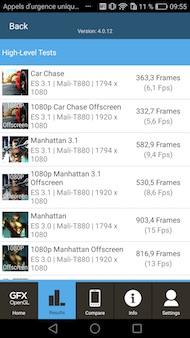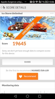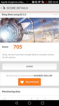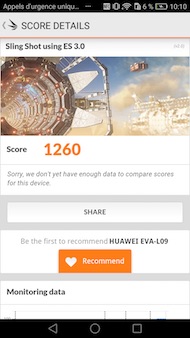 Le système n'est donc pas si léger et la plate-forme aurait bien eu besoin des 4 Go de stockage de la version « Plus ». Une impression qui semble se confirmer aussi bien à l'usage, avec une légère surchauffe du téléphone dans les phases de jeu en 3D, que dans les résultats des benchmarks, même si nous avons quelques difficultés à faire une comparaison puisque le P9 est le premier modèle équipé de Cortex-A72 que nous testons. Rappelons que derrière cet écran Full HD se cache le Kirin 955 de Hisilicon, un chipset avec quatre Cortex-A72, quatre Cortex-A53 et un GPU ARM Mali-T880 MP4. Une petite remarque sur ce dernier avant de dévoiler les scores de la plate-forme, il s'agit théoriquement du même GPU que celui du Galaxy S7. Sauf qu'ici il s'agit d'un quad-core, tandis que Samsung a opté pour un processeur à... 12 coeurs. La différence se fait sentir, soyons clairs !