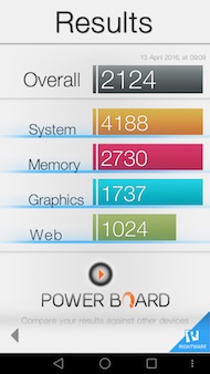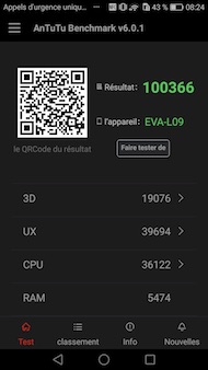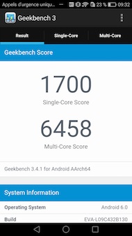 Passons donc aux scores. Sur AnTuTu v6, le P9 atteint 100 366 points. Il est donc largement derrière le Galaxy S7 et l'iPhone 6S (ou l'iPhone SE), lesquels dépassent largement les 120 000 points. Sur Basemark OS II, il atteint 2124 points, un excellent score qui démontre la pertinence du choix d'un écran Full HD. Sur Geekbench, il atteint 1700 points en single-core et 6458 points en multi-core. Ces scores démontrent bien que les Cortex-A72 sont largement au-dessus des Cortex-A57 de l?Exynos 7420, mais bien en dessous des coeurs M1 de l?Exynos 8890.