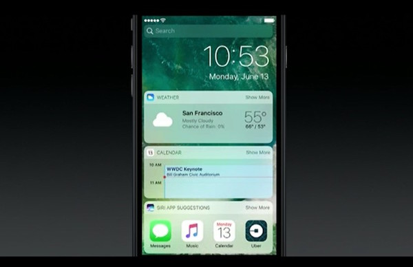Une fois le mobile rebooté, vous accédez à iOS 10 (ou du moins le contenu qu?Apple souhaite rendre public). Petit rappel des faits : en juin dernier, la firme de Cupertino a présenté les grandes nouveautés d'iOS 10. La plus importante est l'arrivée des widgets interactifs sur l?écran de verrouillage, rendant ce dernier enfin utile et pratique. Ces widgets, qui s'apparentent parfois à de simples notifications, offrent en réalité un accès simplifié à de nombreuses fonctions du mobile, sans pour autant le déverrouiller. Ils sont regroupés sur un écran qui leur est dédié.