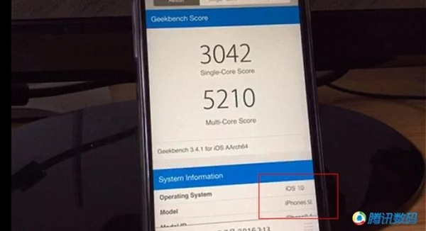 C'est encore une photo mais celle-ci est apparue sur iNews et montre un smartphone avec Geekbench à l'écran. Plusieurs informations importantes sont à relever. La première est donc son nom, iPhone6 SE, alors qu'iOS 10 est naturellement désigné comme l'OS à bord. Evidemment, il serait sans doute facile d'arriver à ce résultat en bidouillant un peu les paramètres mais ce n'est pas fini. Les scores attribués par le benchmark sont également affichés, et il est plus difficile pour un utilisateur lambda de les trafiquer à moins de le faire directement sur l'image et cela ne semble pas avoir été le cas ici. Le smartphone a donc obtenu 5210 en multi-core et 3042 en single-core.