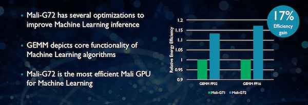 Dernière architecture officialisée : le Mali-G72. Il s'agit du second coeur graphique de la génération G7x. Il remplacera évidemment le G71 et accompagnera le G51. Le G72 fonctionne à 850 MHz. Il se grave en 16 nm. Il offre des performances 40 % meilleures que son prédécesseur en terme de puissance pure et 25 % d'efficacité énergétique. ARM compare même le G72 à des GPU de PC portable, estimant qu'il est capable de rivaliser avec certains d'entre eux. Mais il faut pour cela les multiplier : il en faut huit pour obtenir des résultats équivalents à une nVidia GeForce entrée de gamme.