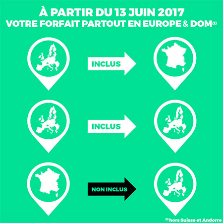 Orange a décidé d'appliquer la fin des frais liés à l'itinérance depuis le 18 mai avec le forfait utilisable dans les zones Europe, DOM, Suisse et Andorre dans les mêmes conditions qu'en France métropolitaine. Les appels, les SMS/MMS et l'enveloppe data en France métropolitaine des forfaits Orange et Sosh sont également valables depuis la zone Europe vers la zone Europe et la France métropolitaine. Les forfaits avec une enveloppe data incluant un débit réduit au-delà, bénéficient également du débit réduit en Europe, DOM, Suisse et Andorre.