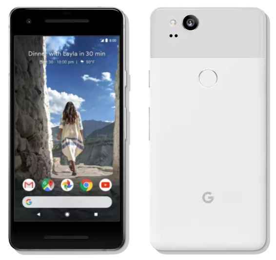 La webcam à l'avant est le même modèle que celle du Pixel : 8 mégapixels avec objectif ouvrant à f/2.4. La focale est fixe. Le système d'exploitation est Android Oreo avec la promesse de 3 ans minimum de mise à jour, ce qui veut dire une migration confirmée vers Android P, Android Q, voire Android R si Google maintient le rythme des versions majeures. Parmi les nouveautés temporairement exclusives du Pixel se trouve Google Lens, un système qui analyse, avec l'aide d'Assistant, ce que le capteur photo perçoit. Cela rappelle Google Goggle.