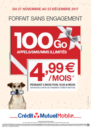Jusqu'au 23 décembre, CIC Mobile et Crédit Mutuel Mobile proposent une réduction de 15? /mois pendant 6 mois. Le forfait est ainsi à 9,99? pour les personnes non clientes du CIC ou Crédit Mutuel, ou à 4,99? pour les titulaires d'une carte de paiement CIC ou Crédit Mutuel. Pour bénéficier de la réduction, il faudra entrer le code NOEL100.