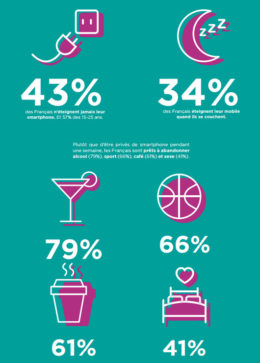 Les Français ne parviennent plus à couper le lien avec leur smartphone. Ainsi, 43% des Français n?éteignent pas leur mobile. Cela monte à 57% chez les 15-25 ans et 64% chez les jeunes filles. Seuls un tiers des Français éteint son smartphone tous les soirs au coucher ou pendant une activité culturelle.