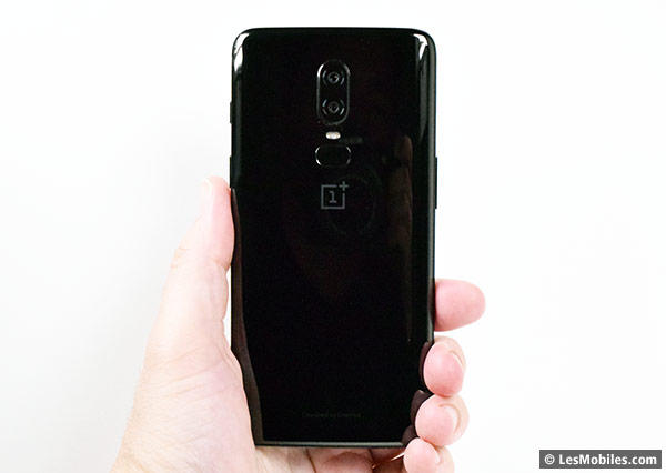 À l'arrière, nous retrouvons non pas une coque en métal, mais une plaque de verre minéral incurvée. Le positionnement des éléments techniques rappelle celui du OnePlus 2. Ou plus encore celui de deux concurrents : le Nokia 8 Sirocco et le Galaxy S9+. Comprenez que le bloc photo est positionné sur la ligne médiane du dos de l'appareil, en verticale, et que le lecteur d'empreinte le souligne. Le flash est pris en sandwich entre les deux.
