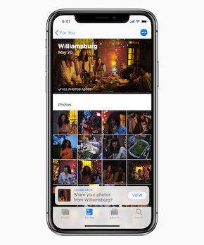 Toujours du côté des améliorations de l'existant, Apple a développé un système pour créer des raccourcis personnalisés pour Siri. Ces raccourcis peuvent être une simple commande vocale, ou une série d'actions successives. Et les développeurs pourront connecter leurs applications à cette nouvelle fonction. Notez que la traduction automatique de Siri prend désormais en compte 40 langues. Autre nouveauté de l'existant, l'onglet « pour vous » dans Photos. Il s'agit d'un onglet qui regroupe en un seul lieu les « Souvenirs » et les partages d'albums (partages sur iCloud ou partages familiaux). Photos vous suggère maintenant avec qui vous pourriez avoir envie de partager des photos, en fonction du leu, des personnes, du type d?événements, etc.