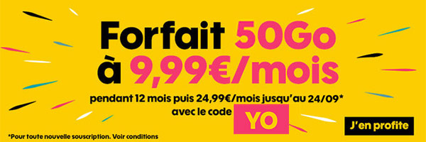 Sosh vient également d'activer une nouvelle offre promo sur le forfait 50 Go. Une belle opportunité à saisir pour la rentrée puisque le forfait Sosh 50 Go passe à 9,99 euros par mois au lieu de 24,99 euros, soit pas moins de 15? de remise par mois, ce qui représente une économie de 180? sur 1 an pour l'ouverture d'une nouvelle ligne !