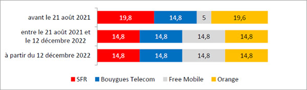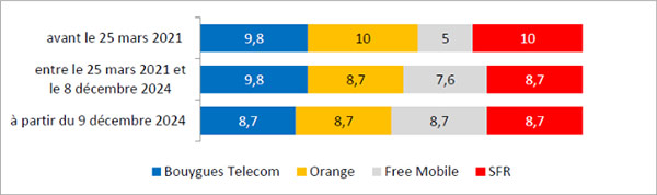 Sur les fréquences 900 MHz, l?ARCEP a décidé de partager équitablement les bandes de fréquences, soit 8,7 MHz pour chaque opérateur, dès le 9 décembre 2024. Le gendarme des télécoms a prévu une étape intermédiaire : Orange et SFR transfèrent 1,3 MHz de leur bande (10 MHz chacun) à Free, soit 7,6 MHz.