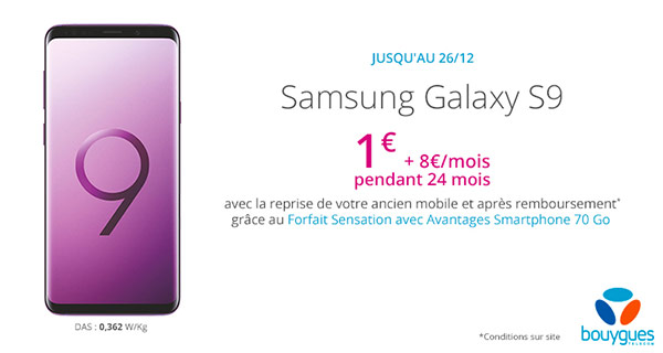 Pour bénéficier du Samsung Galaxy S9 à 1? (son prix sans engagement est de 789?), vous devrez remplir un coupon de réduction de 70 euros offert par Samsung pour tout achat d'un Galaxy S9 jusqu'au 9 janvier 2019. Vous devrez également profiter de 100? de Bonus reprise de votre ancien mobile. Enfin, si vous choisissez le paiement de 8?/ mois pendant 24 mois, le Samsung Galaxy S9 revient à 1? seulement. Attention cette offre n'est disponible que jusqu'au 26 décembre.