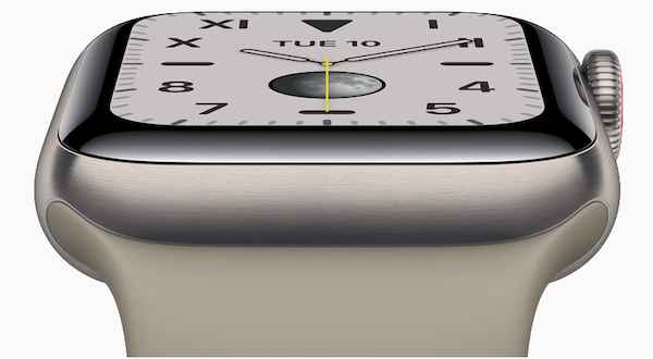 Comme la Series 4, les écrans de la Series 5 mesurent 1,57 pouce et 1,78 pouce. La résolution de ces petites dalles OLED reste à 326 pixels par pouce. Du saphir synthétique protège l?écran, mais aussi les capteurs biométriques qui sont positionnés au dos du boîtier. 3D Touch est toujours présent (contrairement aux écrans des iPhone 11). Et, petite nouveauté de cette série, l?écran est compatible Always-On. Plus besoin donc d'activer la montre (par un mouvement de poignet) pour voir l?heure ou la présence de notification.