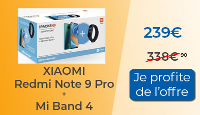 Le deuxième bon plan signé Boulanger aujourd?hui est le pack comprenant le Xiaomi Redmi Note 9 Pro accompagné d'un bracelet Xiaomi Mi Smart Band 4 pour seulement 239? au lieu de 338?. Bénéficiez ainsi d'une réduction de -29%. Avec Boulanger, vous avez la possibilité de régler votre achat en plusieurs fois et de profiter de la livraison à domicile gratuite. Le Redmi Note 9 Pro connaît un large succès parmi la gamme des téléphones Xiaomi. Il est doté d'un écran IPS Full HD de 6.67 pouces, d'un quadruple capteur photo dont un grand-angle de 64 Mpx ainsi que d'une batterie de 5 020 mAh. Il tourne grâce à une puce Qualcomm Snapdragon 720 G et de 6 Go de RAM. Il est proposé avec un espace de stockage de 128 Go.