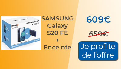 Le Samsung Galaxy S20 FE accompagné de son enceinte de voyage AKG S30 de couleur bleue sont actuellement proposés à 609? au lieu de 659? chez Boulanger. Vous trouverez ce pack seulement chez ce marchand. De plus, vous pouvez aussi profiter de 100? de remise supplémentaire en magasin dans le cadre de l'opération reprise de votre ancien téléphone. Vous pouvez donc acheter le Galaxy S20 FE pour 509? seulement. Sorti en 2020, le Galaxy S20 FE est équipé d'un écran Amoled de 6.5 pouces, de 3 modules photo et d'une batterie de 4 500 mAh. Il est animé par un SoC Snapdragon 865 épaulé par 6 Go de RAM et d'un espace de stockage de 128 Go.