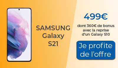 Pour ceux qui seraient les heureux propriétaires d'un Samsung Galaxy S10, vous serez ravis d'apprendre qu'en plus du bonus de reprise de 100?, vous bénéficierez également d'un deuxième bonus de reprise de 260?. Ainsi, profitez de 360? de remise pour tout achat d'un Samsung Galaxy S21. Vous pouvez acquérir ce dernier pour 499? seulement ! Cette offre est valable pour toute reprise d'un Galaxy S10 128 Go en parfait état de fonctionnement et d'aspect extérieur.