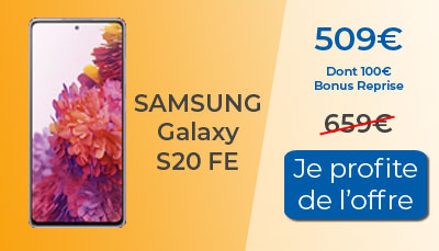 Pour trouver le Samsung Galaxy S20 FE au meilleur prix aujourd?hui, nous vous conseillons de vous rendre directement sur le site du constructeur. En effet, ce smartphone est proposé à 609? au lieu de 659? mais en plus, vous pouvez bénéficier d'un bonus reprise allant jusqu?à 100?. Ainsi, la Galaxy S20 FE ne vous coûtera que 509?. Samsung peut reprend votre ancien téléphone quelle que soit sa marque. Il vous suffit de renseigner son modèle sur le site du constructeur coréen pour connaître la valeur de reprise.