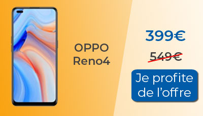 Si vous êtes intéressés par l?Oppo Reno4, c'est le moment pour profiter d'une remise exceptionnelle. Boulanger le propose actuellement à 499? au lieu de 549?, soit une remise immédiate de -9%. Mais le bon plan ne s'arrête pas là, car en plus vous pouvez bénéficier de 100? de remise supplémentaire par le constructeur Oppo pendant les Winter Days. Après votre achat, il vous suffit de remplir en ligne un bulletin de participation en renseignant les informations demandées. Au final, vous ne paierez que 399? pour un Oppo Reno4.