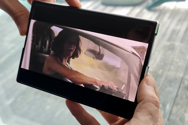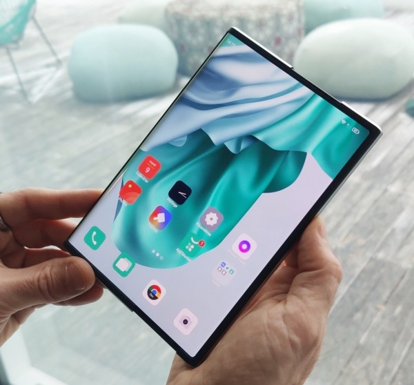 Le Concept Oppo X 2021 propose donc un écran AMOLED flexible d'une diagonale de 6,7 pouces dans sa position normale et peut offrir une surface d'affichage de 7,4 pouces, toujours en diagonale lorsqu'il est totalement déployé ou déroulé. La dalle est signée Samsung Display. Sur le modèle que nous avons pu manipuler, l?écran passe de 6,7 à 7,4 pouces sans s'arrêter. À terme, l'idée serait aussi de proposer des positions intermédiaires, selon l'un des responsables de Oppo. En main, soyons francs, le mobile est assez lourd. N'ayant pas de balance sous la main, impossible de donner son poids avec précision. Peut-être 1,5x le poids moyen d'un mobile, soit environ 300 grammes. Il est également assez épais, 1 cm environ. Toutefois, il reste plus fin qu'un modèle pliant. Le déploiement de l?écran est déclenché soit en appuyant rapidement deux fois sur le bouton d'alimentation (ce qui cause parfois sa mise en veille si on n'appuie pas assez rapidement) ou en réalisant un mouvement de glissement du doigt sur le profil de l'appareil, au niveau du bouton d'alimentation, vers le haut ou vers le bas pour ouvrir ou fermer le mécanisme. Il faut prendre le coup de main (de doigt) pour y arriver. Le système fait un petit peu de bruit, imaginez la nuisance d'un petit moteur électrique, pas rédhibitoire pour autant. La magie s'opère alors lorsque l?écran commence à se déployer comme s'il s?étirait. En réalité, il s'enroule ou se déroule faisant la part belle à l'image.