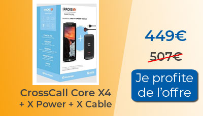 Avec les offres promotionnelles Bonheurs d?hiver pendant les soldes chez Boulanger, il y a de belles promotions sur les smartphones. Le Crosscall Pack Core X4 accompagné de X cable (un cable d'alimentation magnétique) et d'une batterie externe X Power 2 de 6000 mAh est proposé avec -11% de réduction. Il est donc affiché à 449? au lieu de 507?. De plus, jusqu'au 1er mars, vous pouvez obtenir en supplément 50? de bonus reprise sur votre ancien téléphone. Ainsi votre pack vous reviendrait à 399? seulement !