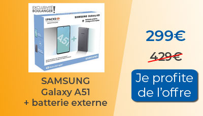 Boulanger propose en exclusivité un pack comprenant le Samsung Galaxy A51 avec en plus un Powerbank 25W pour seulement 299? au lieu de 429?. Profitez ainsi d'une remise de -30% sur ce pack. Attention cette offre promotionnelle ne sera pas disponible très longtemps. Le PowerBank est une batterie externe sans fil. Elle vous permet de recharger facilement votre smartphone même lorsque vous n'avez pas de prise de courant à proximité. C'est parfait pour ceux qui se déplacent beaucoup et qui ne veulent pas être à court de batterie.