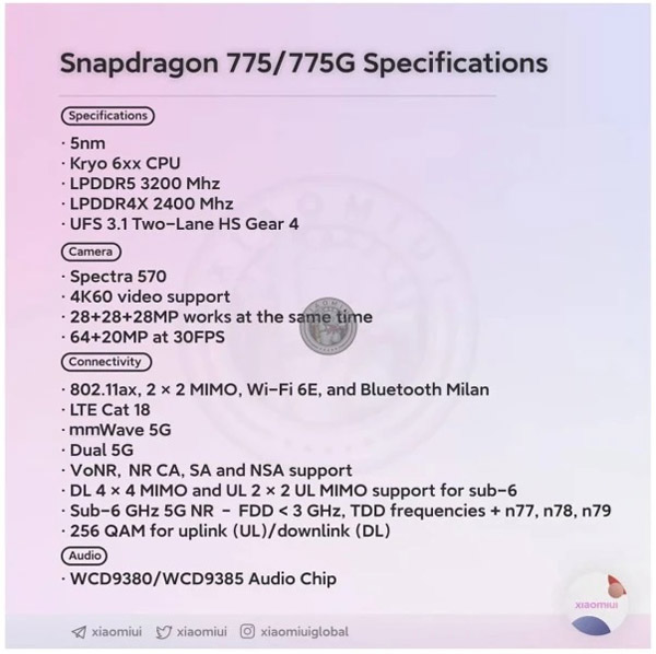 Selon un document interne à Qualcomm, le Snapdragon 775 (SM7350) profite d'une finesse de gravure de 5 nm, comme le Snapdragon 888. Cela lui permet d'obtenir des performances particulièrement intéressantes notamment pour les smartphones de milieu de gamme sur lesquels il est prédestiné. Il devrait donc battre sérieusement l'actuel Snapdragon 765G qui est gravé en 7 nm.