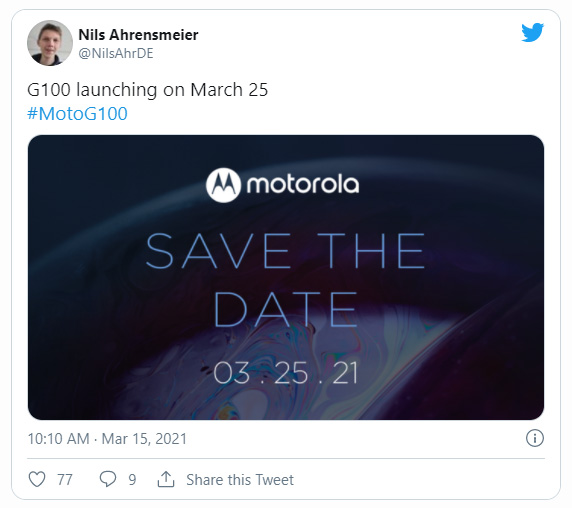 Plutôt que de proposer une série complète de mobiles haut de gamme, Motorola préfère s'intéresser au milieu de gamme avec l'arrivée prochaine d'un modèle baptisé Moto G100 qui serait une déclinaison du Edge S lancé officiellement en Chine fin janvier. Celui-ci pourrait être officiellement dévoilé le 25 mars, car la marque semble organiser un événement à cette date, selon un twittos souvent bien renseigné. Le Moto G100 serait doté d'une puce Qualcomm Snapdragon 870 avec 6 ou 8 Go de RAM et 128 ou 256 Go de mémoire interne. Il disposerait d'un écran de 6,7 pouces 90 Hz, LCD et de trois capteurs photos au dos (64+16+2 mégapixels) ainsi que d'une batterie de 5000 mAh.