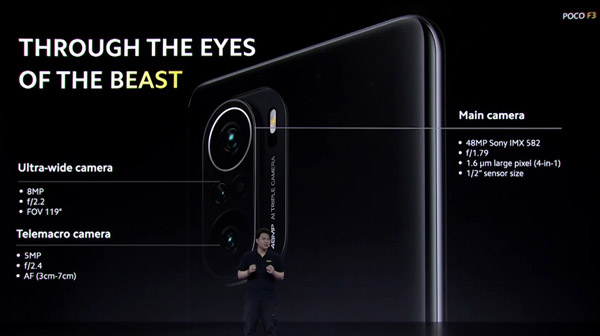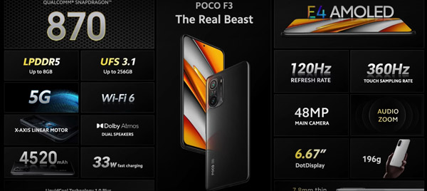 De son côté, le Poco F3 profite d'une puce plus véloce, le Snapdragon 870. Il est associé à 6 ou 8 Go de RAM et 128 ou 256 Go d'espace de stockage interne au format UFS 3.1. Il est doté d'un écran AMOLED HDR10+ 120 Hz d'une diagonale de 6,67 pouces avec une définition de 1080x2400 pixels.